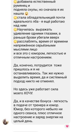 Благодаря тому, что занятия длятся 6-7 недель и тренер сопровождает вас на всём этом пути, вы уже во время курса увидите очевидный результат на вашем лице и научитесь контролировать свою мимику.