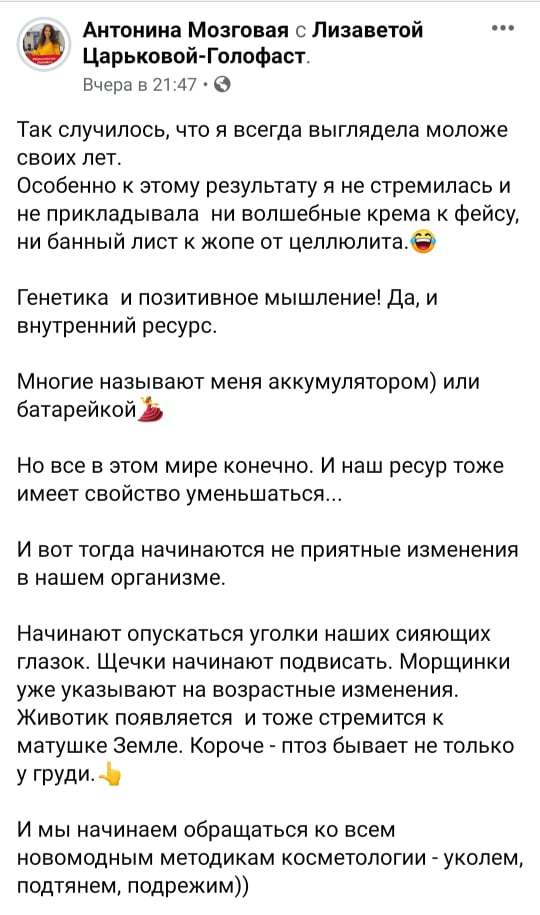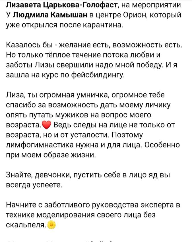 Лизавета Царькова-Голофаст – тренер по фейсбилдингу, специалист в области антивозрастных методик омоложения лица, включающих лимфодренажный массаж лица и шеи. Действующий эксперт в онлайн-проекте Валерии Иноземцевой «Счастье как стиль жизни». Координационный тренер программы по снижению веса «Детокс» и по гармоничному похудению (для тех, кто после деторождения хочет восстановить и лицо тоже, а не только фигуру), а также в случаях со стрессовым похудением ( подтяжка лица после резкого снижения веса).